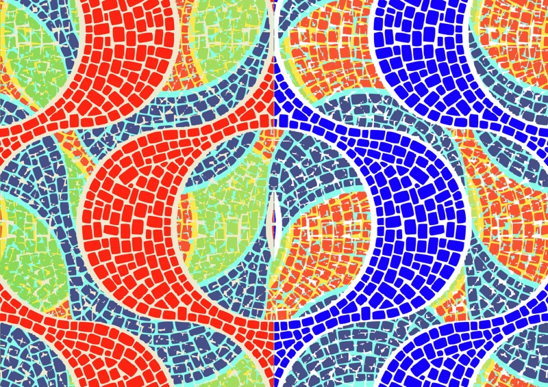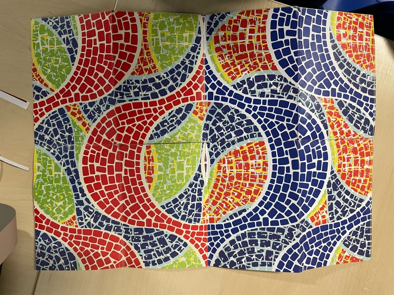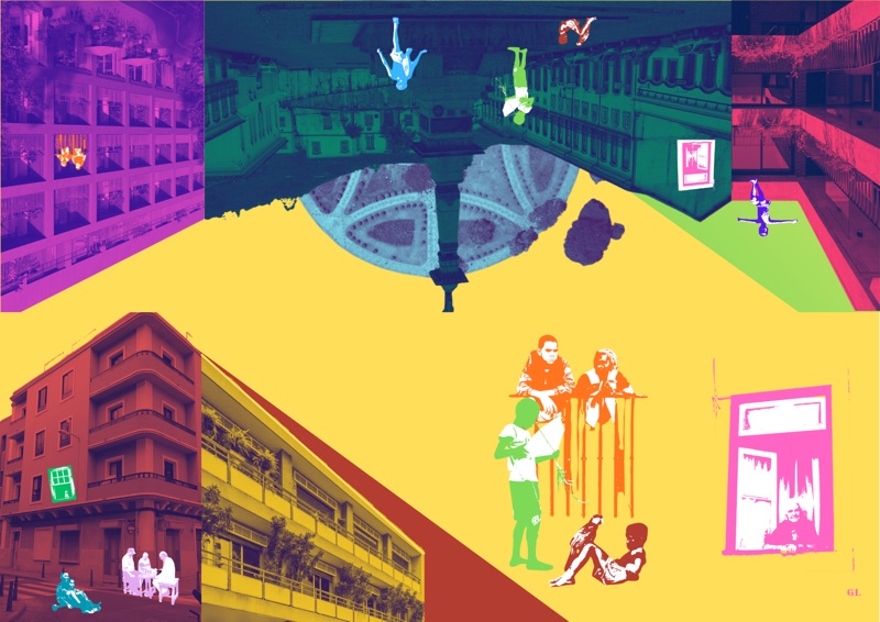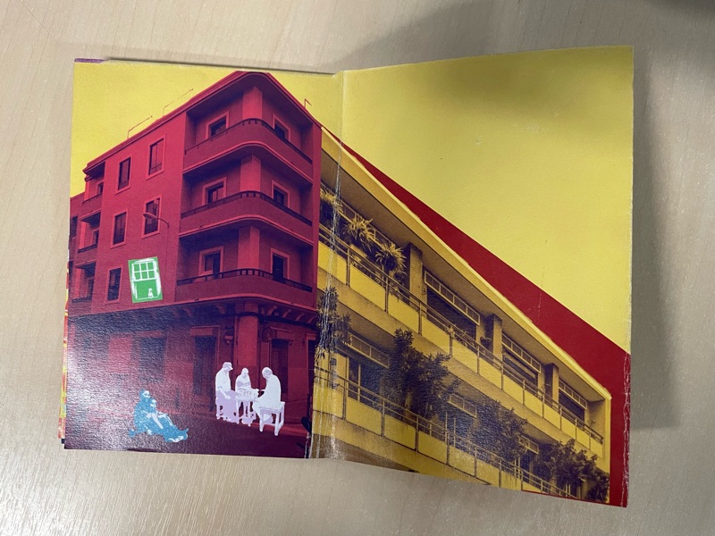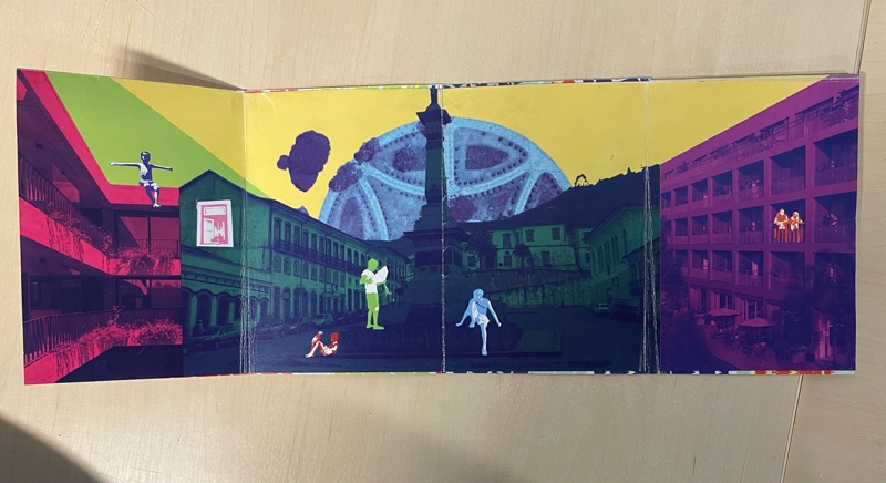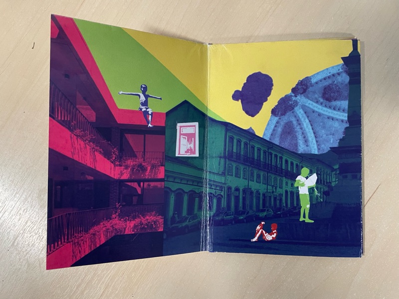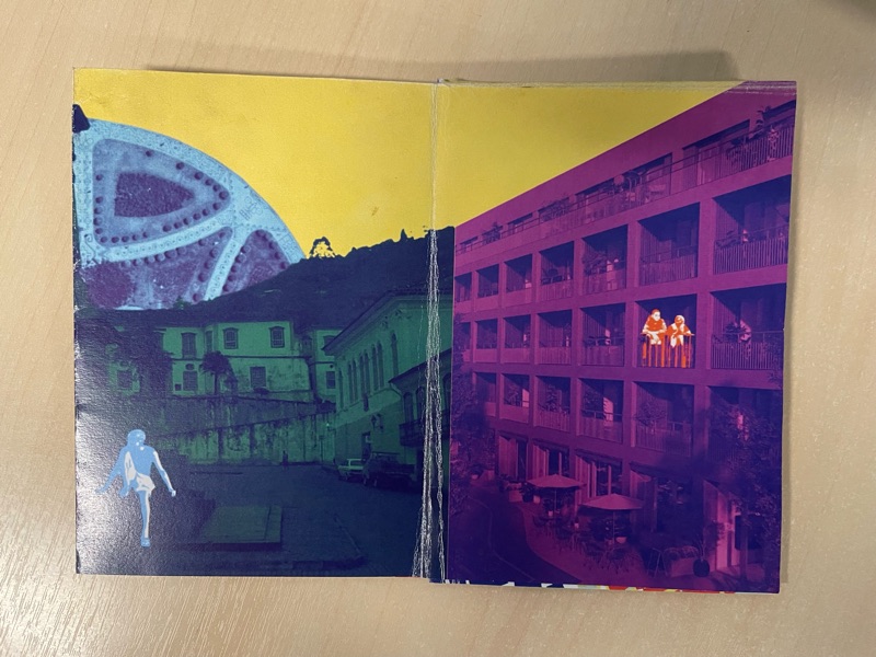 A premissa da colagem era de tentar realizar uma obra que fizesse sentido tanto na parte quanto no todo, com espaços que dialogassem com as pessoas e vice-versa em cada parte do zine. Para isso procurei nas imagens que os grupos disponibilizaram no Drive, aquelas que pudessem criar essa sensação que eu procurava. Alterei graficamente as imagens e as juntei posteriormente no tamanho do A3. Para a abstração, também utilizei uma imagem do Drive e realizei algumas alterações nas cores, formato e composição da imagem.